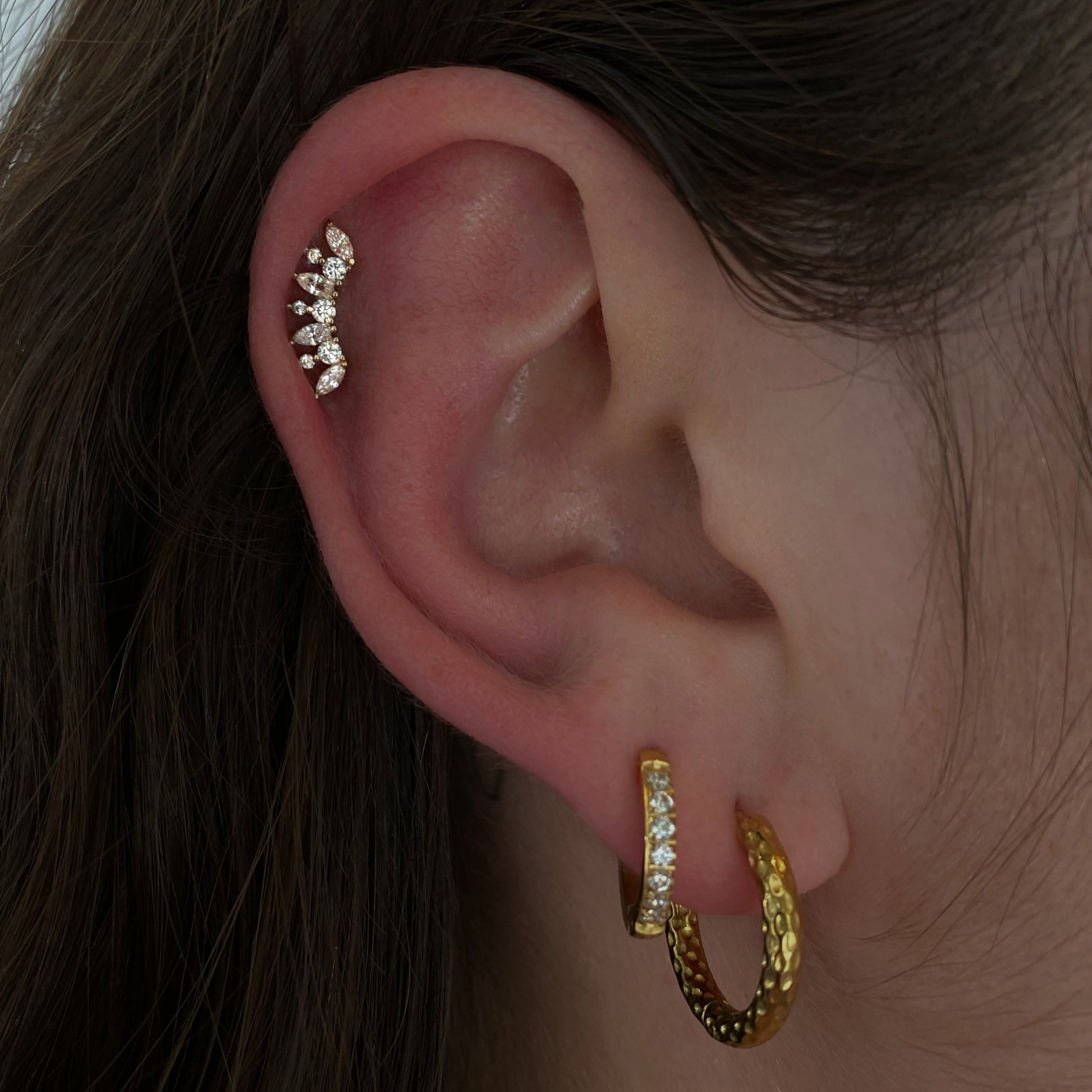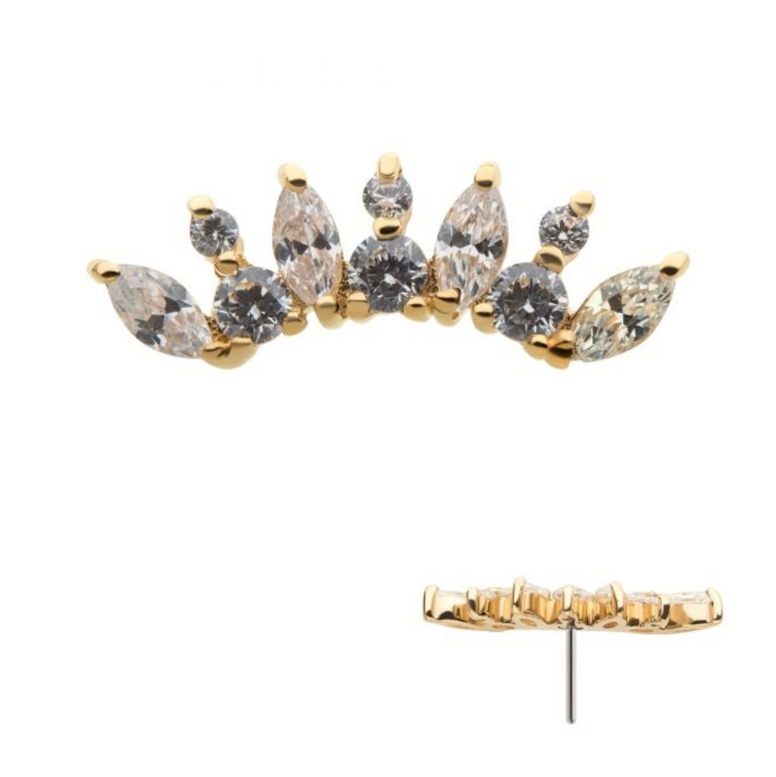 Solid 14Kt Yellow Gold threadless top, with prong set round & marquise clear CZ's. This piece is perfect for Helix and Conch piercings. Need a post/backing for this top? Check out our threadless labrets!