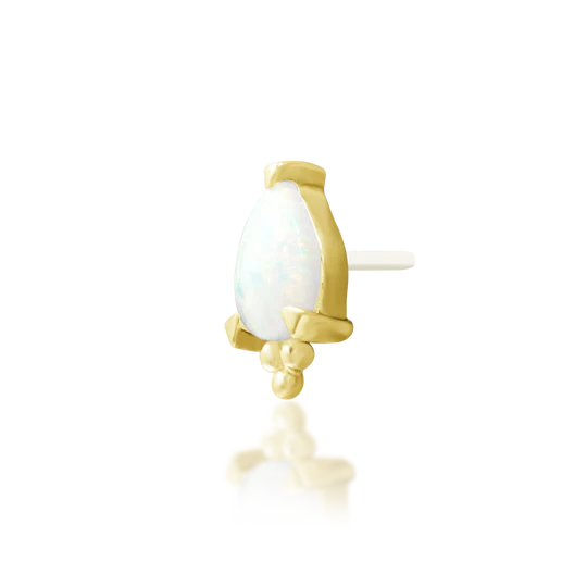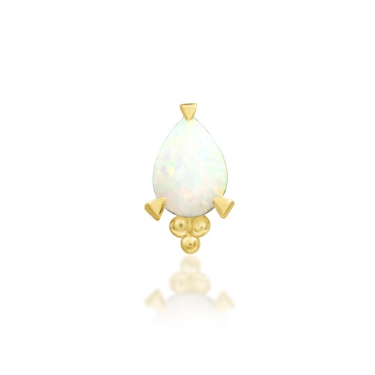 Introducing Artemis, a stunning threadless 14k yellow gold top adorned with a 3.5 x 5.8mm pear-shaped opal stone. The understated elegance of this piece is enhanced by delicate bead detailing, providing a timeless and sophisticated look. Elevate your style with Artemis today.