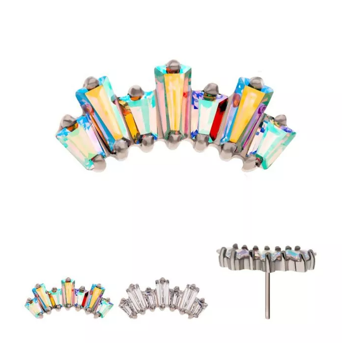 Threadless Prong Set Baguette CZ 7-Cluster Fan Shape Top. Implant Grade Titanium TI-6AL-4V ELI ASTM F136. Need a post/backing for this top? Check out our threadless labret posts! Clear CZ or Aurora Borealis crystal choices.