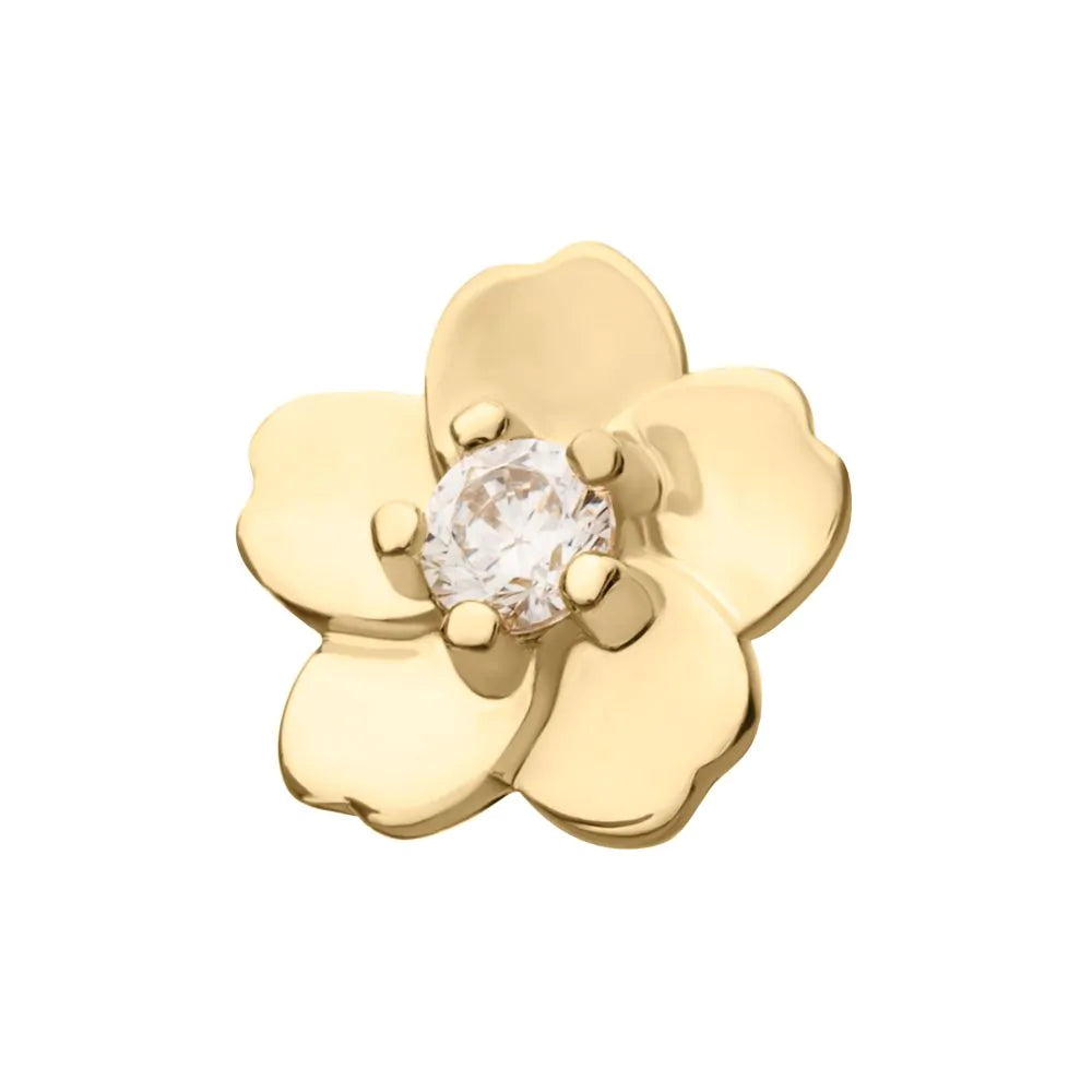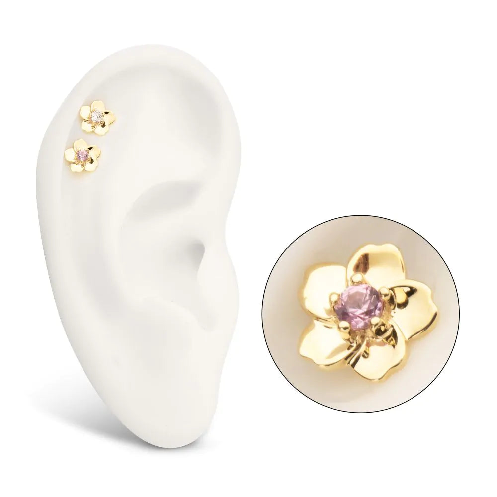 Our 14Kt Yellow Gold Cherry Blossom Flower Top blends elegance and symbolism, inspired by Japan's cherished cherry blossoms. Crafted from solid, nickel-free 14kt gold with a durable 316LVM ASTM F-138 Implant Grade Steel Pin, it ensures both practicality and ease of use across all sizes in our threadless body jewelry line (Pin Size: 0.45mm x 4.7mm).
