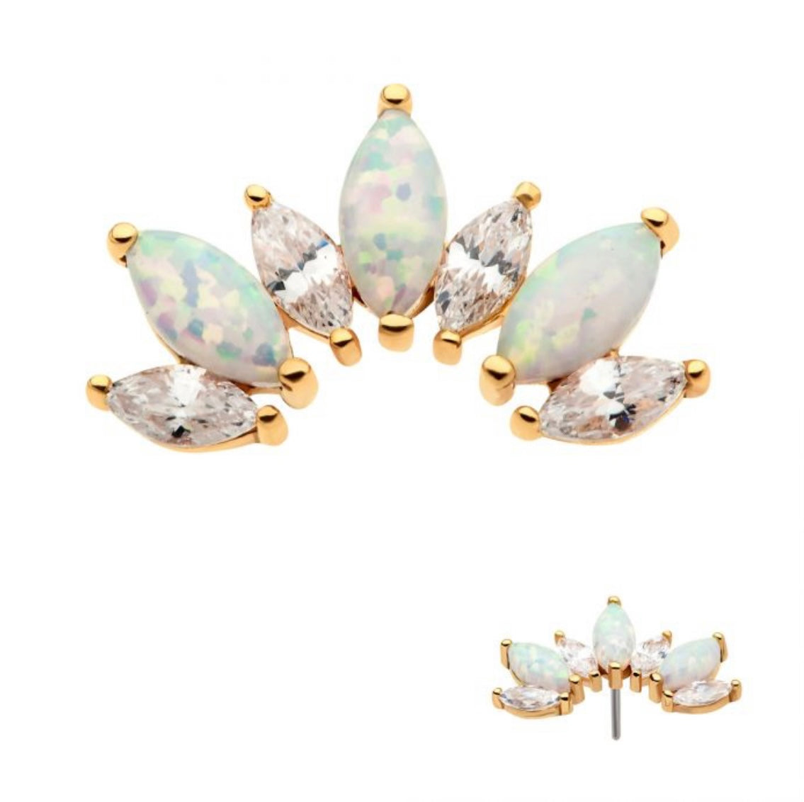 Embrace the timeless allure of opals, the brilliance of cubic zirconias, and the elegance of 14KT yellow gold with this captivating threadless top. Elevate your style and make a statement that reflects your inner radiance.