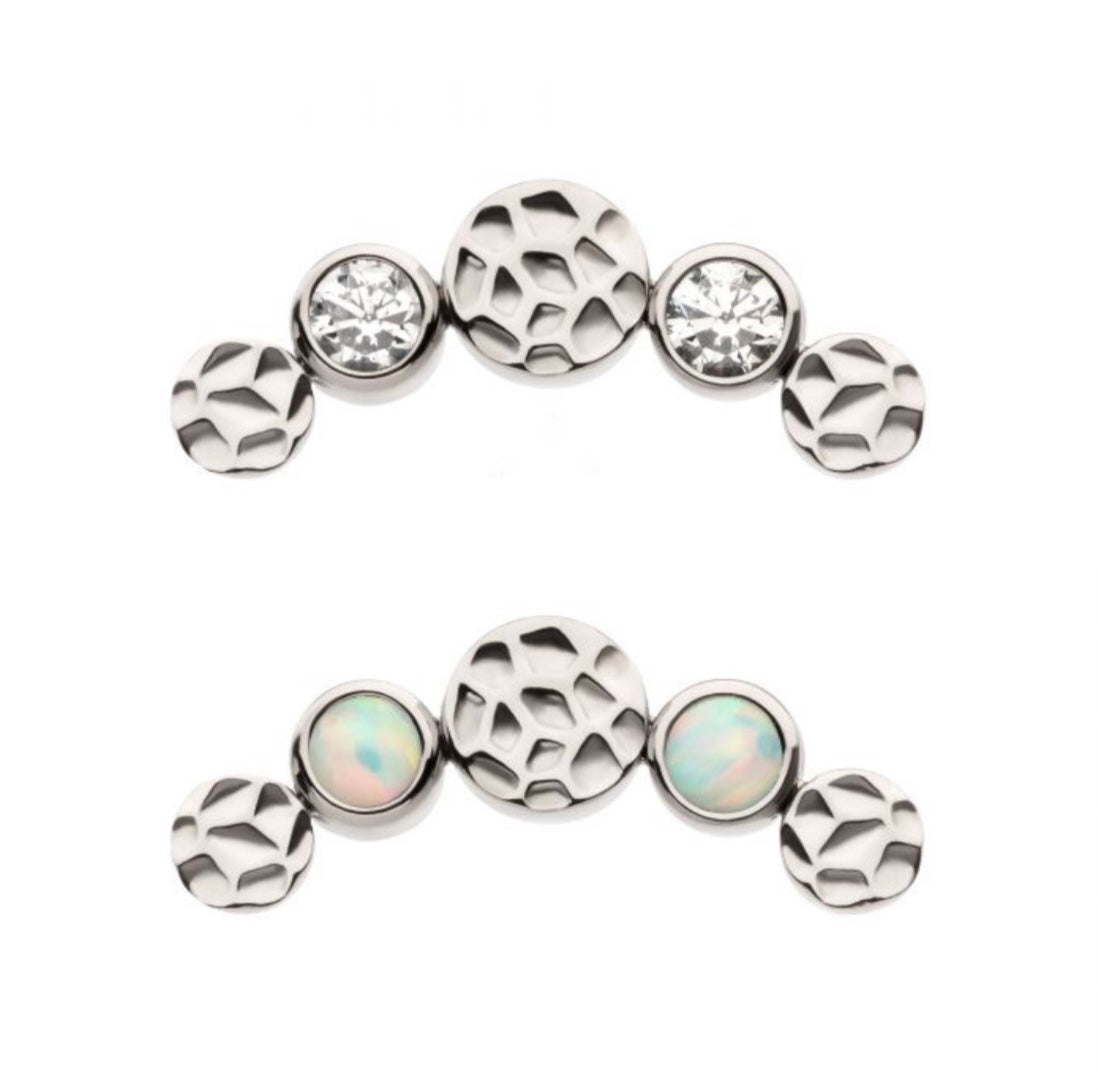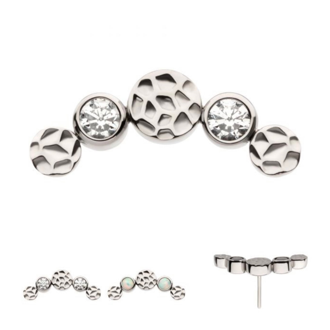 Embrace the allure of hammered textures and gemstones, along with the durability of titanium, with this captivating threadless top. Elevate your body adornment with the rustic elegance and brilliance of our Hammered Cascade Top.