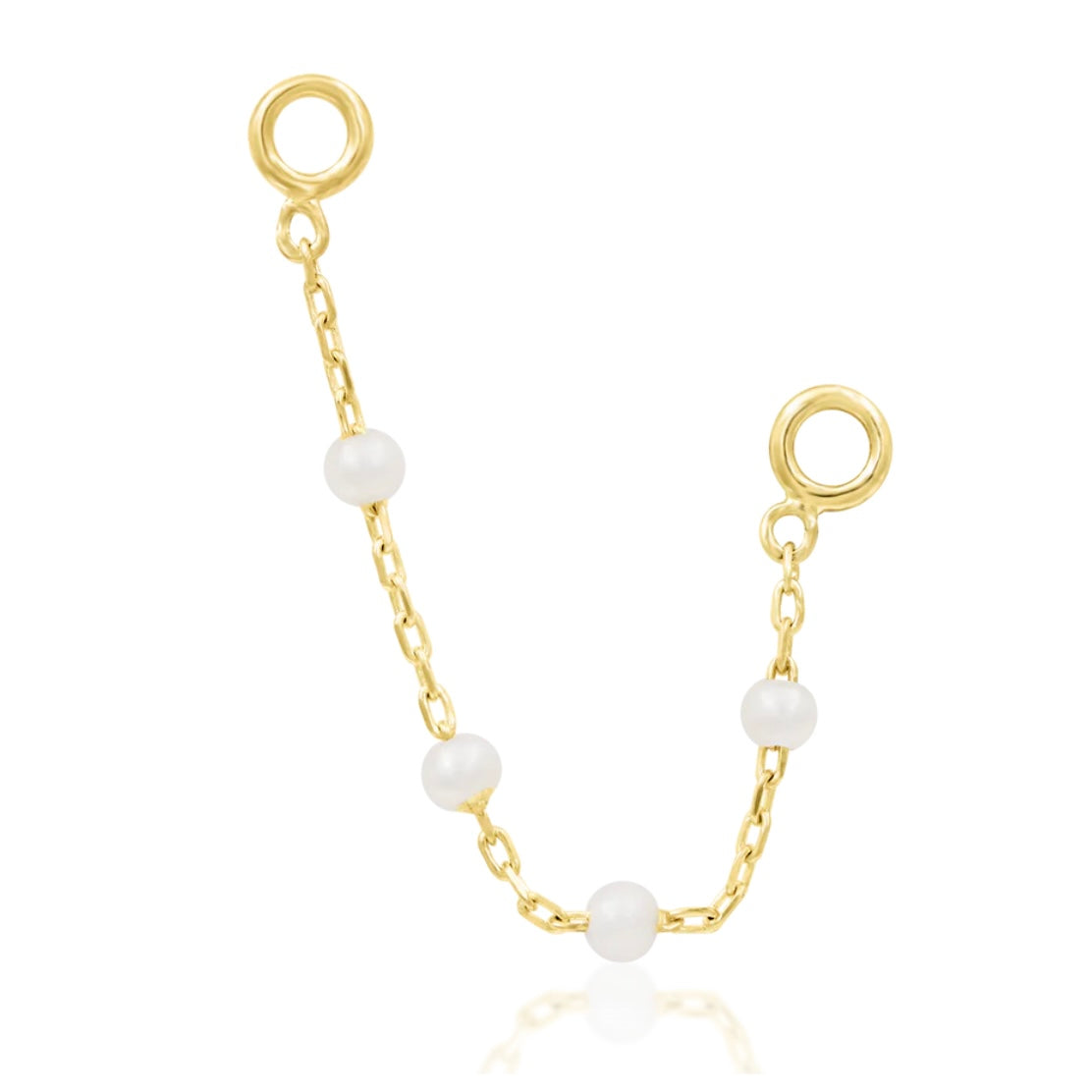 Louise is an edgy yet elegant 3.3mm x 42mm double-sided chain attachment featuring a chorus of 4 x 2.3mm genuine freshwater pearls. It measures 30mm not including the rings on both sides. 38mm with rings. This pieces can be attached to studs in ear piercings. Made of solid 14K Gold.