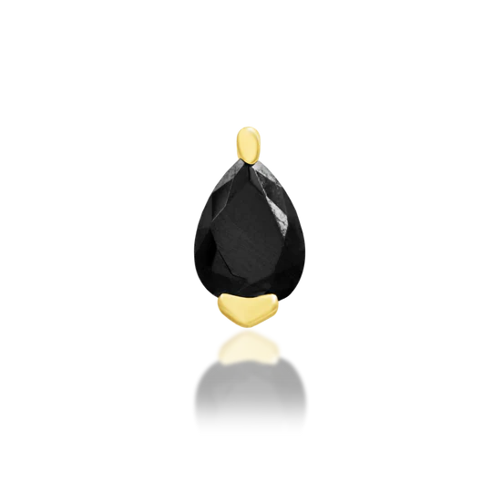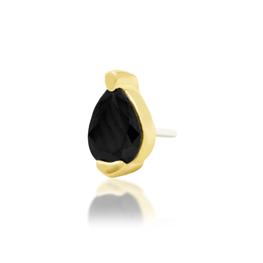 Expertly crafted, the Paige threadless top pairs 14k yellow gold with a black cz tear drop gem for a simple yet stunning look. With a delicate 2mm x 3mm size, this accessory is the perfect touch of elegance and sophistication.