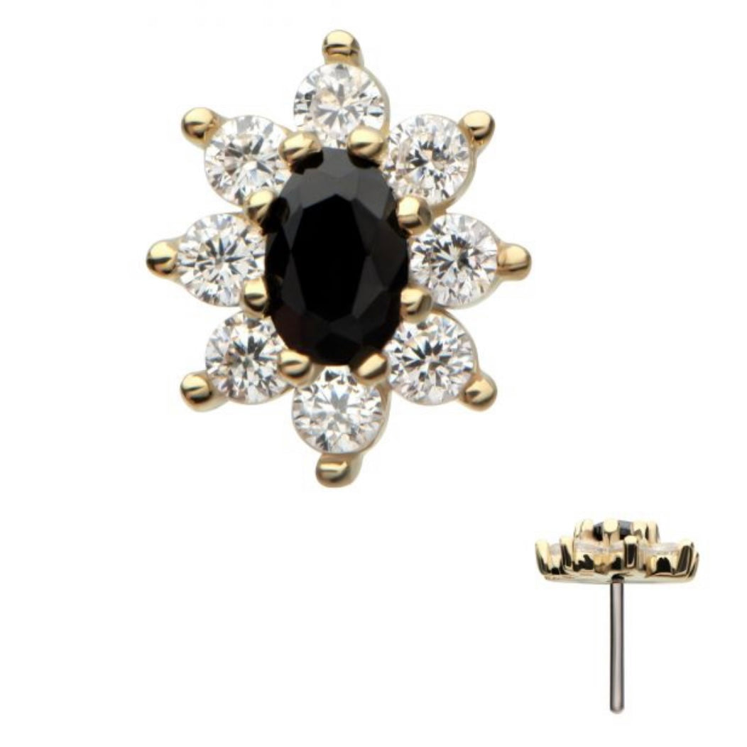 Threadless prong set Oval & Round CZ top. Made of solid 14kt nickel-free yellow Gold. Need a post/backing for this top? Check out our threadless Labrets! Dimensions: 6.4mm (L) x 5.3mm (W) x 1.9mm (H)