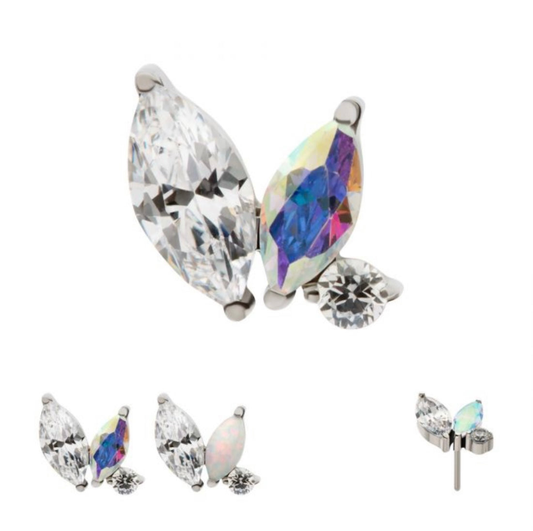 The focal point of this top consists of three marquise-cut stones, each in a different size. These gems create a subtle and graceful curve, adding an element of movement and dynamic beauty to the design. The staggered arrangement adds a touch of uniqueness while still being timeless.
