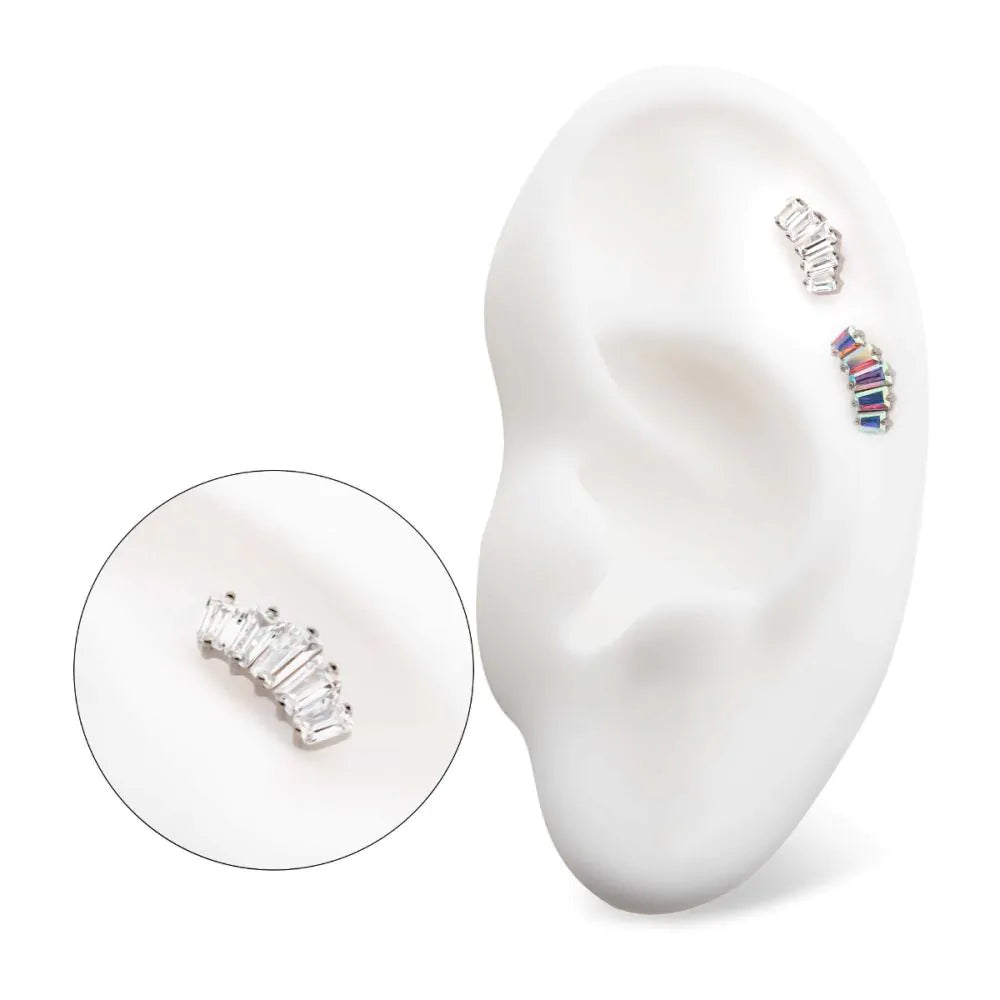 Crafted from superior implant grade titanium, our Titanium Baguette Cascade features a stunning cascade of clear or aurora borealis cz baguette gems. With a secure threadless top, this piece is both elegant and functional, making it a versatile and perfect addition to any jewelry collection.