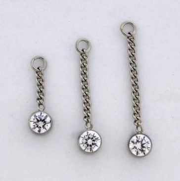 ASTM F-67 titanium curb chain with 5mm round cubic zirconia gem dangle at the end. Attach to any jewelry piece for an instant upgrade, using the jump ring at the top.