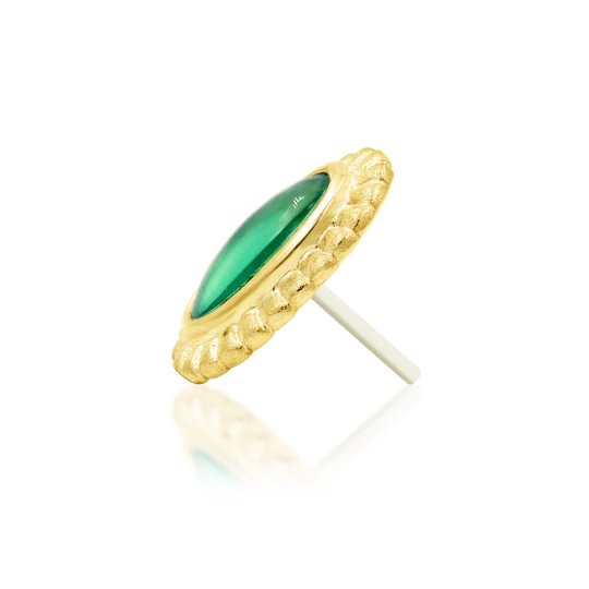 This stunning threadless top features an exquisite oval Genuine Chrysoprase cabochon, beautifully framed with delicate frills of 14kt yellow gold. The vibrant green hue of the Chrysoprase contrasts elegantly with the rich warmth of the gold, creating a piece that is both eye-catching and sophisticated. Designed for versatility and style, this threadless top is perfect for adding a touch of elegance to any piercing.