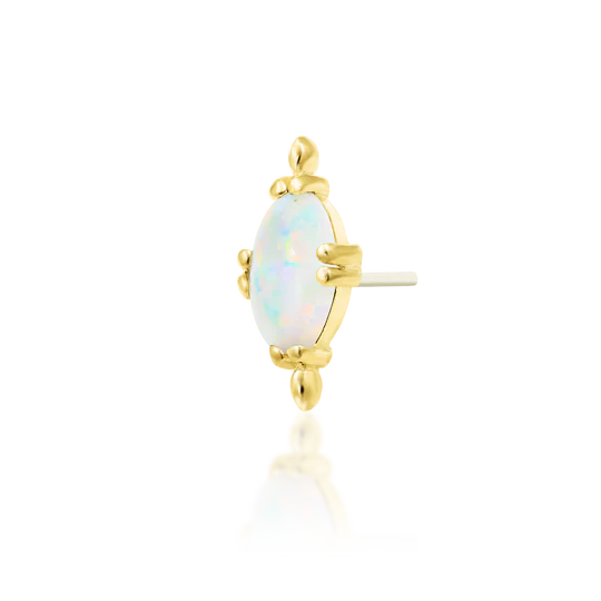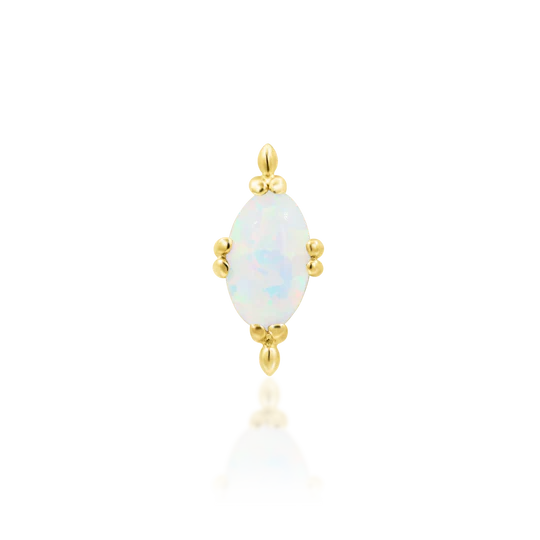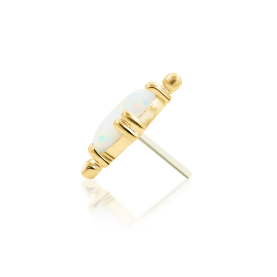 This exquisite threadless top showcases a stunning 3x5mm white faux opal oval cabochon, radiating a captivating play of colors. The cabochon is beautifully paired with a flourish of delicate gold beads, adding an elegant touch of sophistication. Crafted from high-quality 14k yellow gold, this piece not only ensures durability but also offers a timeless and luxurious look. Perfect for enhancing any piercing, this threadless top is a versatile and stylish addition to your jewelry collection.